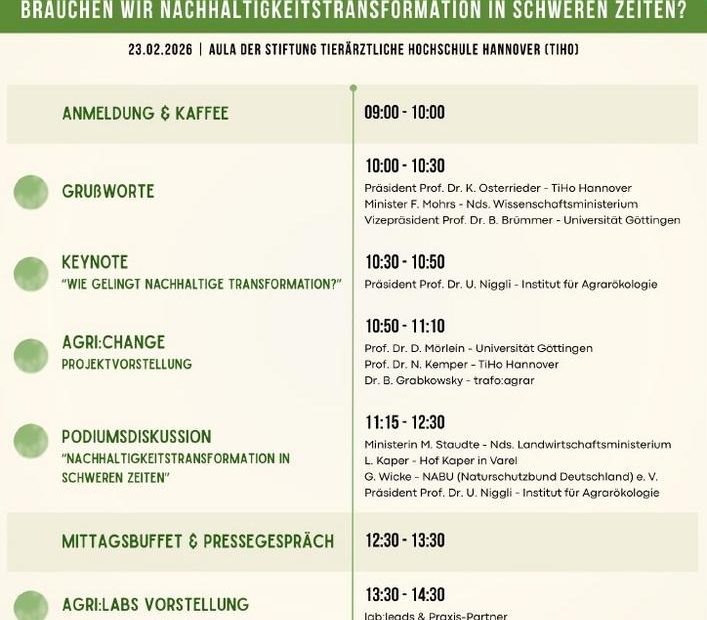 Eingebettet in die Tagung „Zukunft durch Wandel?!“ Mit einer öffentlichen Auftaktveranstaltung startet das Verbundvorhaben agri:change, das konkrete Transformationspfade für eine zukunftsfähige Agrar- und Ernährungswirtschaft entwickeln will.… Weiterlesen »Auftakt des Forschungsprojekts agri:change (Pressetermin | Hannover)