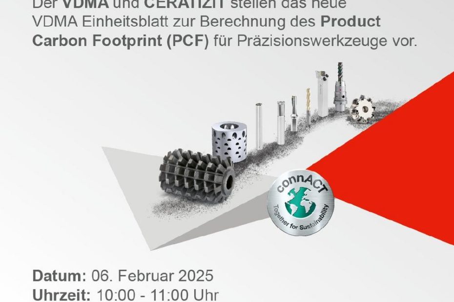 Der VDMA und CERATIZIT veranstalten gemeinsam ein Webinar zum Thema Product Carbon Footprint (PCF) für Präzisionswerkzeuge. Das Webinar findet am 6. Februar 2025 von 10:00 bis 11:00 Uhr online statt.
