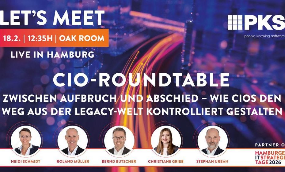 Im Rahmen der Veranstaltung gestaltet PKS einen CIO-Roundtable, der sich mit der Frage befasst, wie Unternehmen den Weg aus historisch gewachsenen Legacy-Strukturen kontrolliert und verantwortungsvoll gestalten können. Der Roundtable findet am Mittwoch, 18. Februar 2026, von 12:35 bis 13:20 Uhr im Oak Room statt.