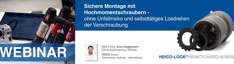 In unserem Webinar erfahren Sie, wie Sie mit den neuen HEICOLOCK® Reaktionsscheiben große Schraubenverbindungen sicher und präzise mit Hochmomentschraubern anziehen und gleichzeitig Ihre Verschraubung wirksam vor dem selbsttätigen Losdrehen schützen.