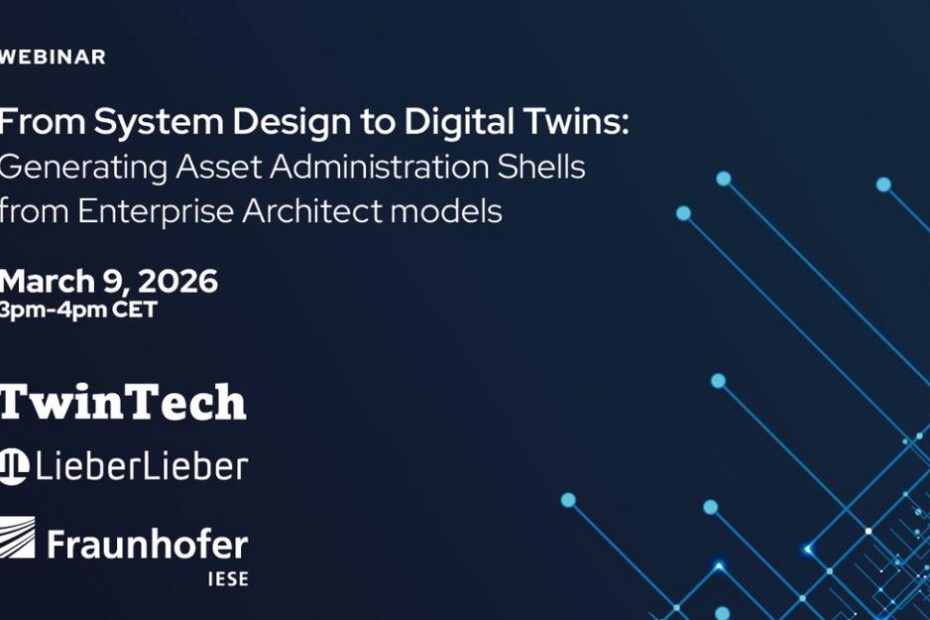 Together with our partners TwinTech and Fraunhofer IESE, we cordially invite you to attend the webinar ‘From System Design to Digital Twins: Generating Asset Administration Shells from Enterprise Architect models’ on Monday, 9 March 2026 (3:00 p.m. – 4:00 p.m.).