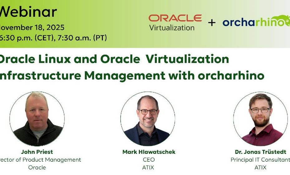 Oracle Linux and Virtualization Management with orcharhino Date: Tuesday, November 18, 2025, 16:30 p.m. (CET) Language: English Simplify Infrastructure and Virtualization Management Discover how orcharhino… Weiterlesen »Oracle Linux and Oracle Virtualization Infrastructure Management with orcharhino (Webinar | Online)