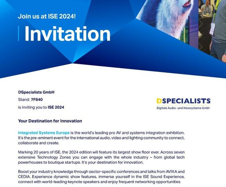 From 30 January to 02 February 2024, we will be taking part again in Integrated Systems Europe (ISE) in Barcelona. ISE is the world’s most visited… Weiterlesen »DSPECIALISTS Digitale Audio- und Messsysteme GmbH at Integrated Systems Europe Barcelona 2024 (Messe | Barcelona)