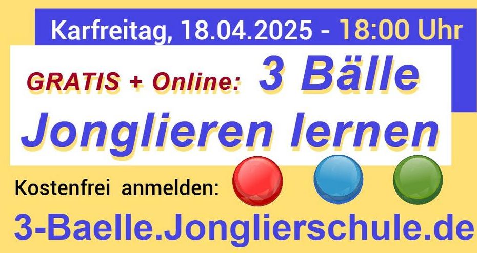Am Karfreitag, den 18. April ist der TAG DER JONGLEURE! An diesem Tag gibt es um 18:00 Uhr einen GRATIS-JONBGLIERKURS für ANFÄNGER.Deutschlands erfolgreichster Jongleur, Stephan… Weiterlesen »3 Bälle jonglieren lernen für Anfänger – LIVE – ONLINE + GRATIS! (Workshop | Online)