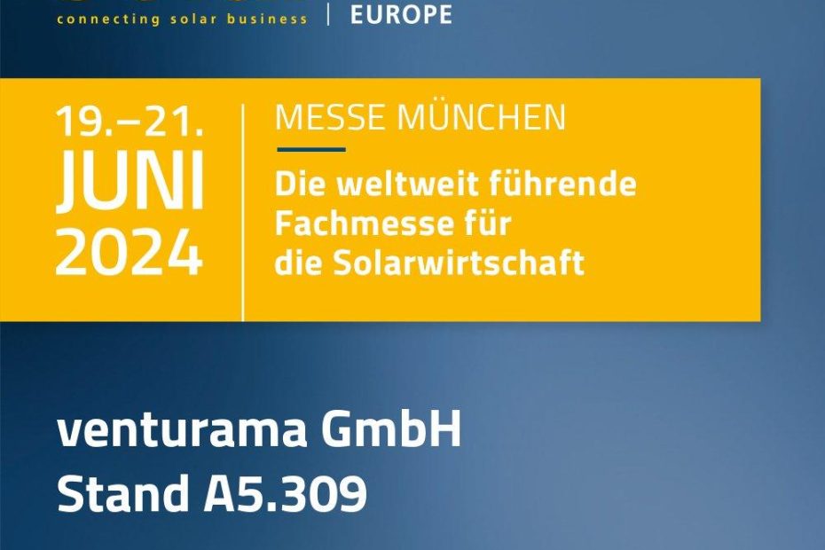 Wir von venturama Solar sind vom 19. bis 21. Juni 2024 auf der Intersolar Europe in München dabei. Die weltweit führende Fachmesse für die Solarwirtschaft… Weiterlesen »Besuchen Sie venturama Solar auf der Intersolar in München! (Messe | München)